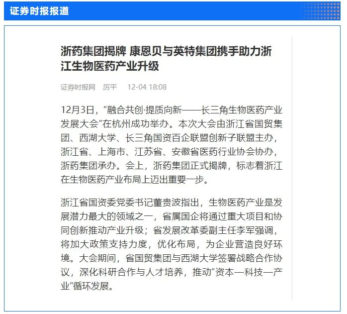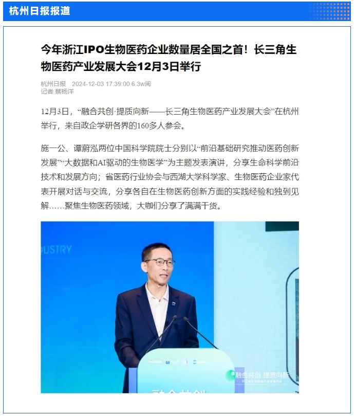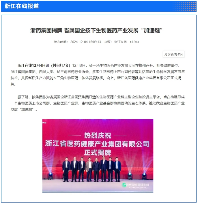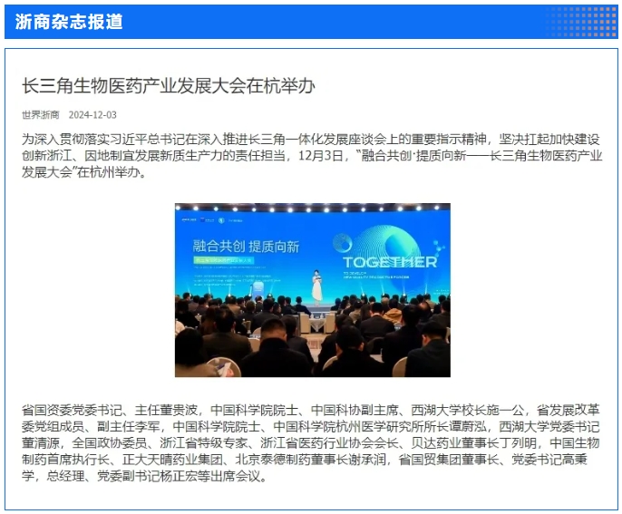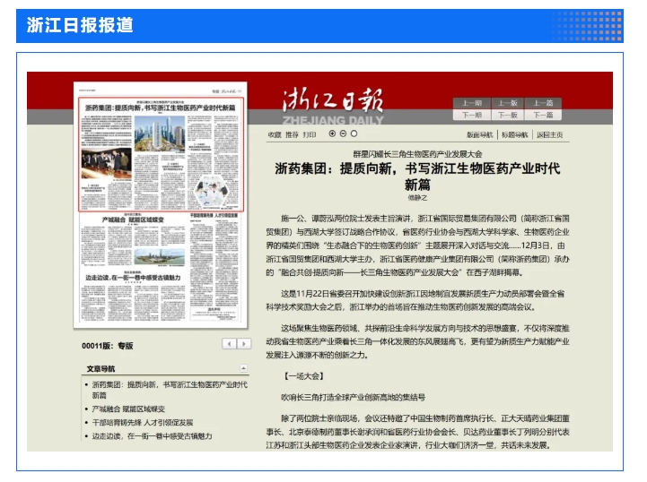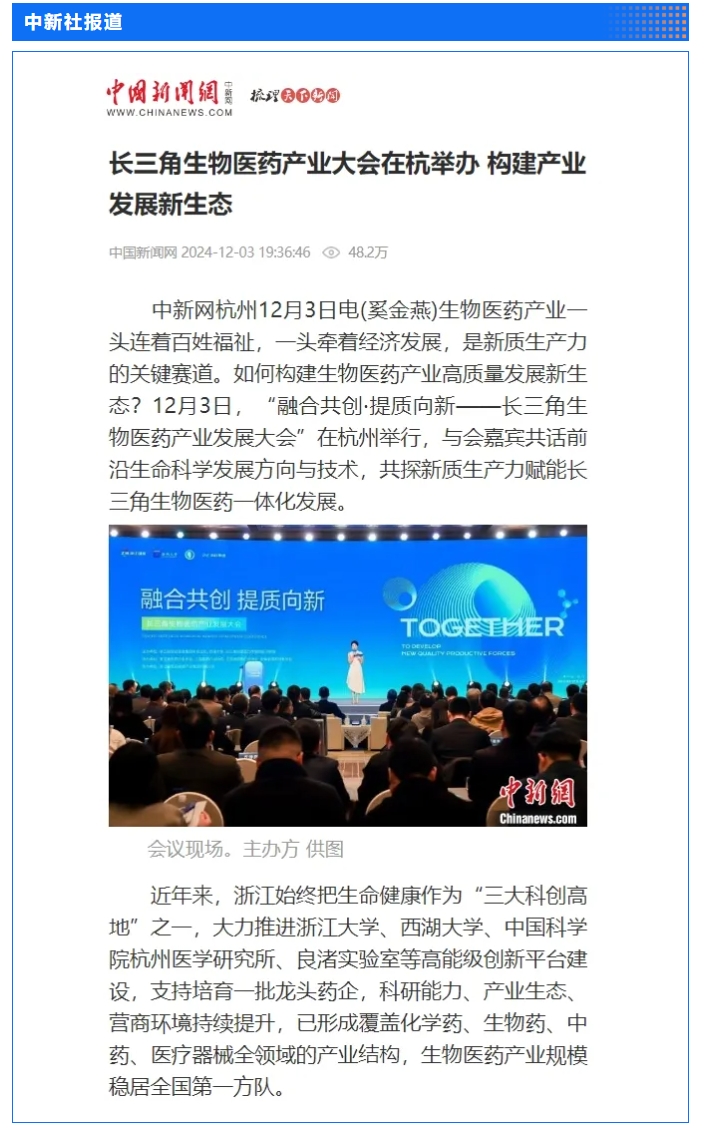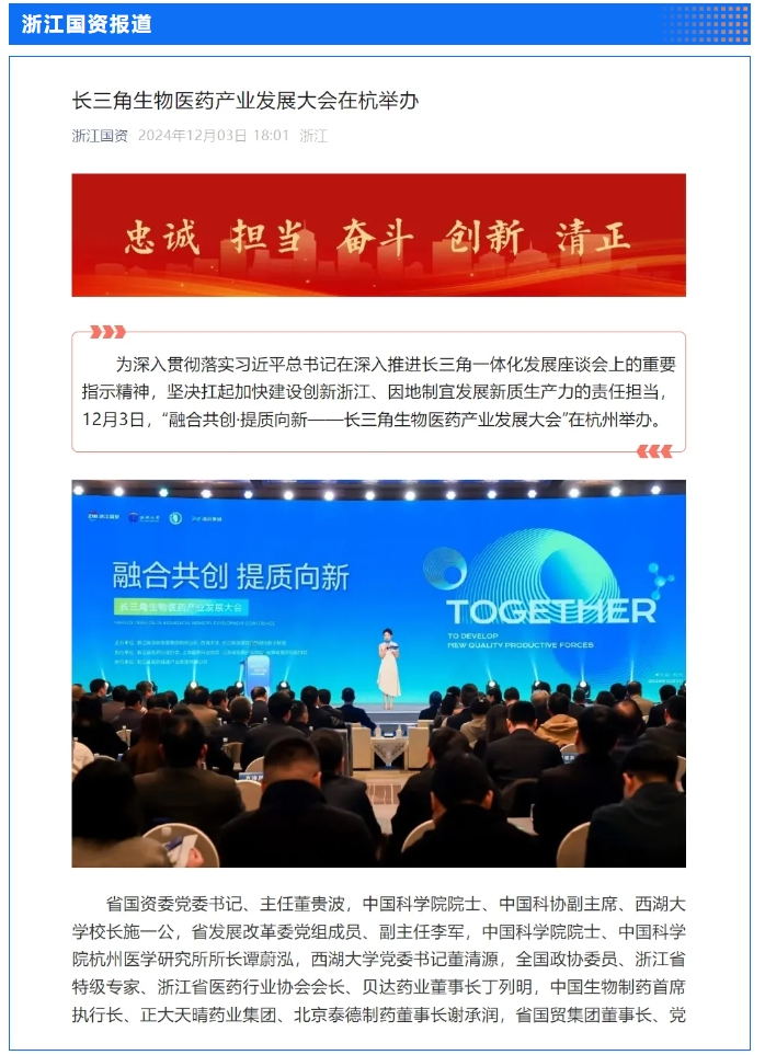 12月3日,省国贸集团和西湖大学主办,集团下属浙药集团承办的“融合共创·提质向新——长三角生物医药产业发展大会”在杭州圆满举行,会上,行业专家和企业家聚焦前沿生命科学的发展趋势与技术革新,共同探讨如何构建长三角生物医药一体化发展新格局。浙江日报专版深度聚焦会议情况,中新社、央视网、证券时报、浙江在线、浙江国资、浙商杂志、杭州日报等多家媒体对会议进行了报道。