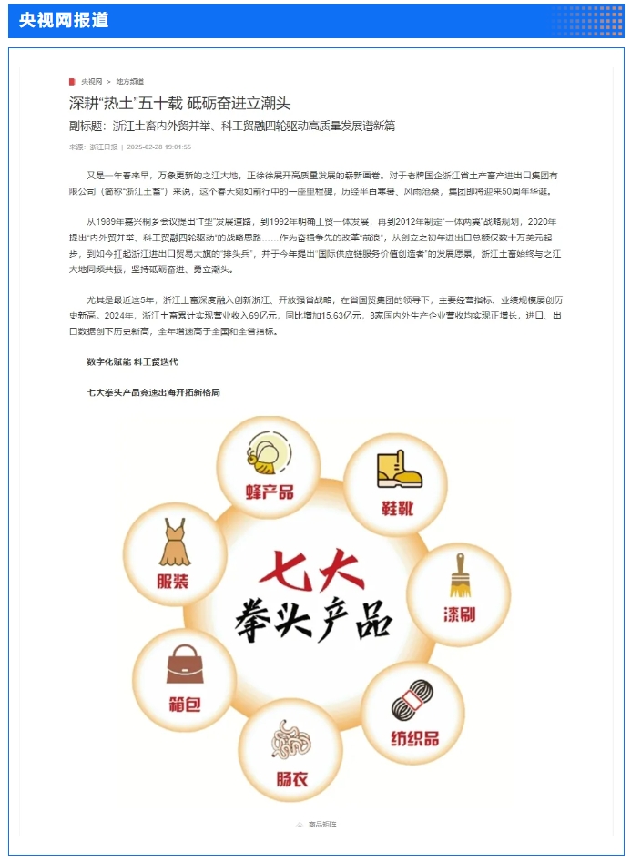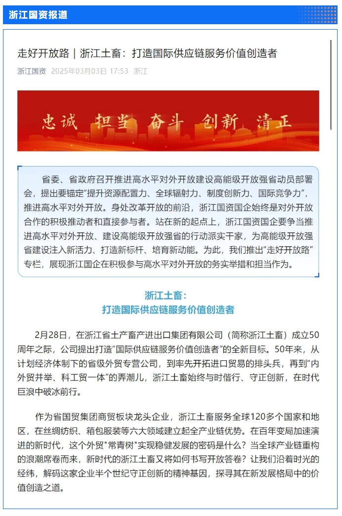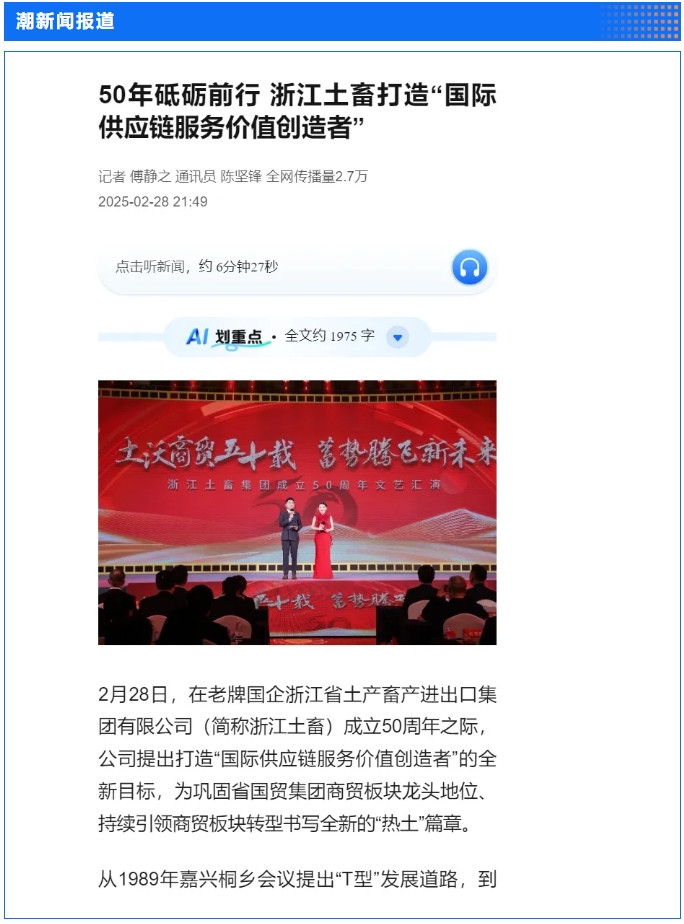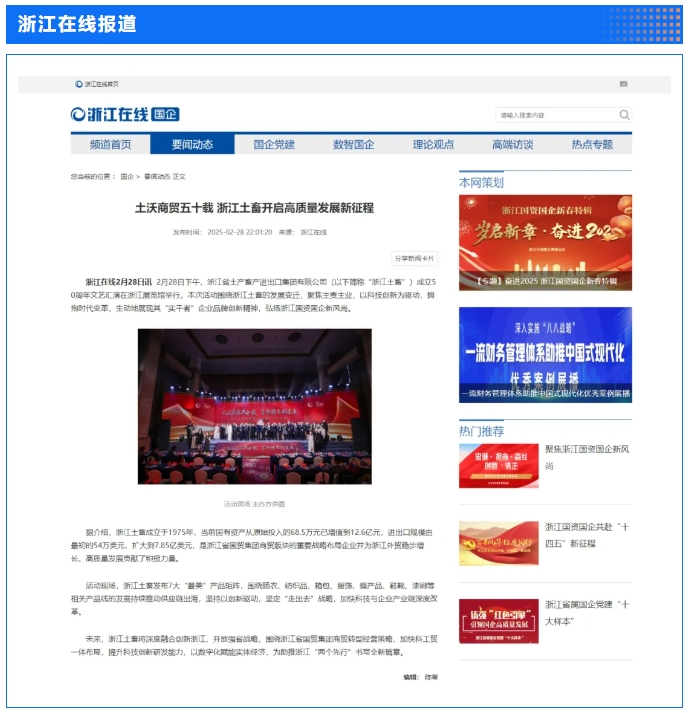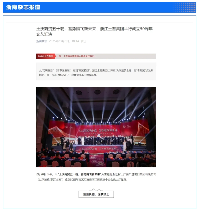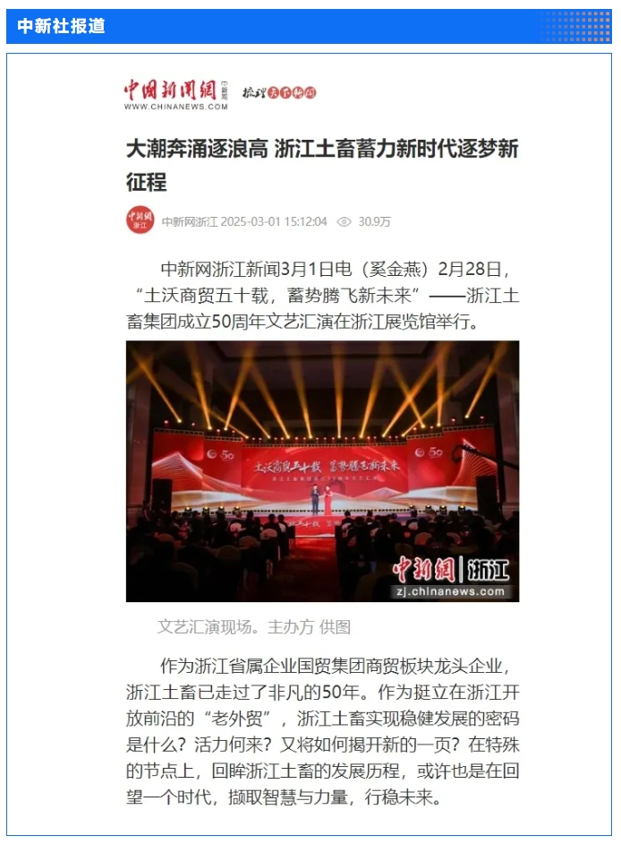 2月28日,“土沃商贸五十载,蓄势腾飞新未来”——浙江土畜集团成立50周年文艺汇演在浙江展览馆中央金色大厅举行。汇演生动展现了省国贸集团下属浙江土畜一路走来的蝶变历程,更憧憬展望了浙江土畜美好未来。中新社、央视网、浙江日报、浙江国资、浙江在线、潮新闻、浙商杂志等多家媒体对汇演进行了报道。